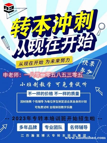 南京师范大学泰州学院五年制专转本辅导班来江苏瀚宣博大专转本培训学校通过率高,有五年制专转本英语和所有主考院校专业课的培训,课时多,授课针对性强,还有内部自编教材,涵盖当年考试考点,分析往年考试重点,不同基础不同报考院校和专业的考生分班上课,小班授课,老师经验丰富,对转本考点和重点掌握透彻,讲课通俗易懂,由浅入深,让同学们快速ti fen ,轻松考取本科,更多五年制专转本详情联系申老师一八零(威)二零五八(同)五三零五预约试听课并可领取招生简章!