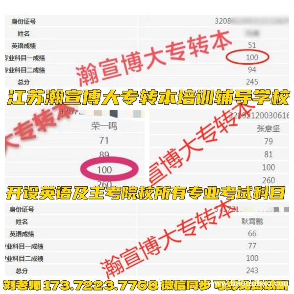 江苏瀚宣博大专转本是江苏省一家针对性、专业化、系统化、连锁化主做五年制专转本(五年一贯制专转本)培训辅导学校,15年教学辅导经验,拥有强劲的师资力量,详细精准的内部.学习资料,靠通过率说话、靠口碑立足,历年来帮助上万名考生成功转本,圆本科梦,深受众多考生及家长的推荐和信赖,江苏省各大城市均开设校区,各校区都有历年录取学员名单和高分榜,各位考生或家长可到校区实地考察及了解!各位考生或家长也可添加瀚宣博大专转本刘老师微信,关注刘老师朋友圈实时更新,刘老师173(微)7223(同)7768,还可预约免费测试或试听!